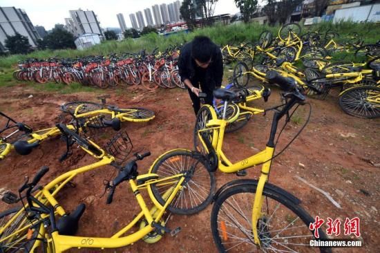 9月9日,一位民眾在凌亂堆放的共享單車里掃碼。中新社記者 李進紅 攝