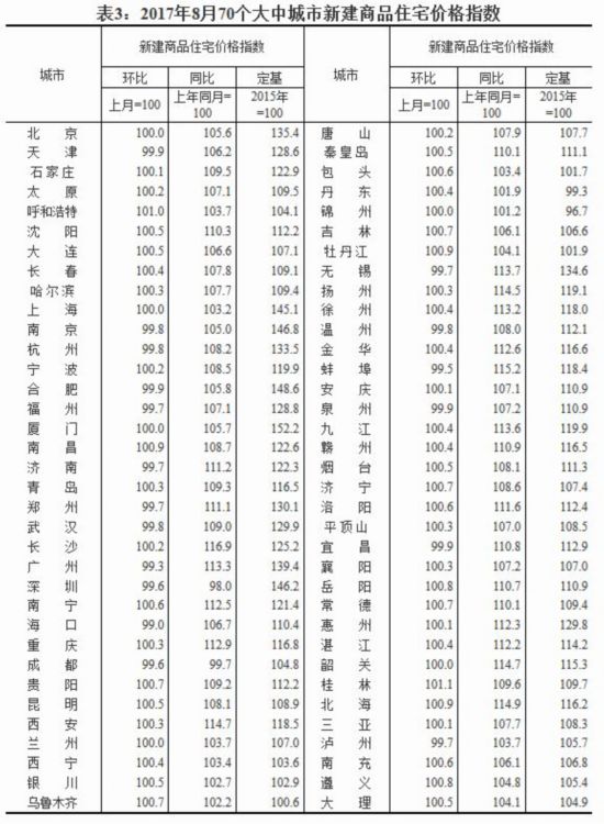 2017年8月70個大中城市新建商品住宅價格指數。來源:國家統計局YEX安康新聞網