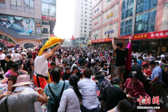 9月15日,商戶在北京天意商城甩賣商品,吸引大批顧客搶購。天意商城是北京規模最大的小商品批發兼零售市場,為疏解北京非首都功能,天意商城將于9月16日關門停業。中新社記者 盛佳鵬 攝