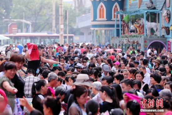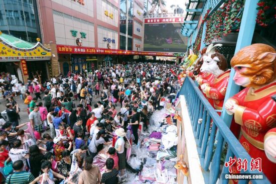 9月15日,商戶聚集在北京天意商城門口甩賣商品,吸引大批顧客搶購。天意商城是北京規模最大的小商品批發兼零售市場,為疏解北京非首都功能,天意商城將于9月16日關門停業。中新社記者 盛佳鵬 攝