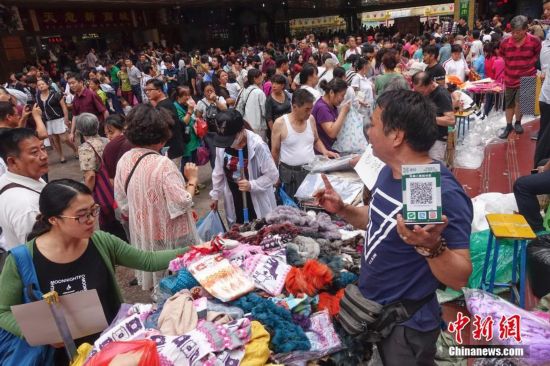 9月15日,天意商戶舉起二維碼方便顧客掃碼支付,以新式支付方式助力傳統零售。當日,自1992年開業至今的北京天意市場迎來其在北京西城阜外大街營業的最后一日,商家趁機“瘋狂甩貨”,大批北京民眾也紛至沓來。這里曾是北京著名的小商品商城,聚集了數千家商戶。為疏解北京非首都功能,天意商城將于本月16日關門停業。中新社記者 崔楠 攝