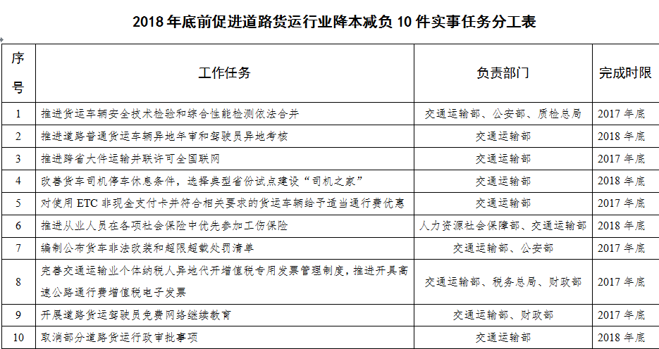 2018年底前,完成降本減負(fù)10件實(shí)事(見附件),推動政策落地并取得實(shí)質(zhì)性進(jìn)展。制度性交易成本大幅降低,貨車司機(jī)生產(chǎn)生活條件顯著改善,貨運(yùn)業(yè)戶的獲得感和貨車司機(jī)的歸屬感持續(xù)增強(qiáng),行業(yè)平穩(wěn)發(fā)展的基礎(chǔ)更加牢固。