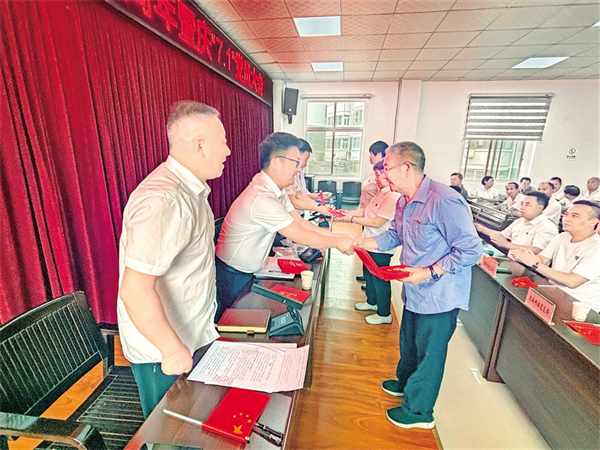 6月26日上午,嵐皋縣城關鎮西坡社區黨組織為黨齡滿50年的3名老黨員頒發“光榮在黨50年”紀念章,給每名參會黨員送上“政治生日賀卡”。魏代續 廖霖 攝i2e安康新聞網
