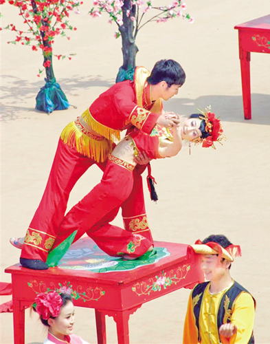 安康小場子在表演風格上,丑角以逗趣為主,表演潑辣,旦角含蓄。唱詞說詞詼諧幽默,演出形式也頗有趣味:鬧臺打畢之后丑角上場,隨著旦角上桌后,二人在鑼鼓伴奏中表演“走圓場”“三纏腰”“三見面”“三碰頭”等舞蹈組合,然后二人對唱“拜場花鼓”,意為問候觀眾拜請同行關照的謙和之辭。按唱本的要求演唱八岔戲小調或花鼓調,主要是以說唱為主,僅在鑼鼓間奏中做些即興舞蹈,結束時照例有一段“落場花鼓”給觀眾作以交代,最后隨著長板鑼鼓做與開始相似的舞蹈組合。