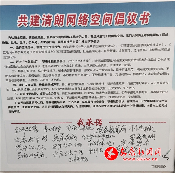 會議組織傳達學習了省市輿論環境集中整治專項行動工作會議精神;市公安局、市文廣局就網絡輿論環境整治工作做了匯報發言;與會人員共同發起并簽訂了《共建安康清朗網絡空間倡議書》;5家網絡媒體及平臺代表圍“繞弘揚主旋律、傳播正能量,營造清朗網絡空間”進行了表態發言。