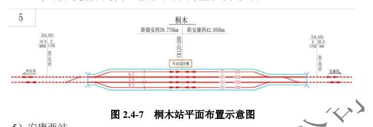 車站初始規3臺8線布置,遠期隨天水一十堰鐵路引入預留1臺2線(PS:另一條高鐵過境安康,美),總規模4臺10線。到發線有效長650m,設島式站臺(450×12×1.25m)4座,設旅客進出站地道2座(寬12m)。