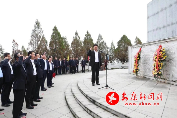 牛蹄嶺戰役遺址是全市愛國主義教育基地,中國人民解放軍第十九軍在此打響的牛蹄嶺戰役為解放安康乃至陜南作出了重要貢獻。春日的牛蹄嶺蒼勁翠郁、豐碑聳立。上午9時許,市委常委班子成員拾階而上來到牛蹄嶺戰役紀念碑廣場,向在戰役中英勇犧牲的革命烈士默哀并敬獻花籃,表達緬懷之情。面對黨旗,大家重溫入黨誓詞,鏗鏘的宣誓聲響徹牛蹄嶺、回蕩山谷間。隨后,大家認真聆聽激戰牛蹄嶺的紅色歷史,瞻仰牛蹄嶺戰役紀念碑,追憶革命先輩英勇無畏、舍生取義的崢嶸歲月。