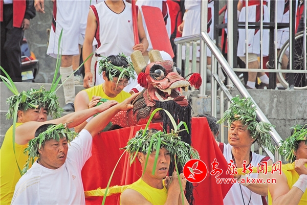 2010年6月13日,第十屆安康龍舟節(jié)開幕前一天,所有參賽船隊在西關(guān)土地廟迎接老黑龍至漢江邊,并舉行了龍舟開賽前的下水祭祀儀式。鄧軍 攝