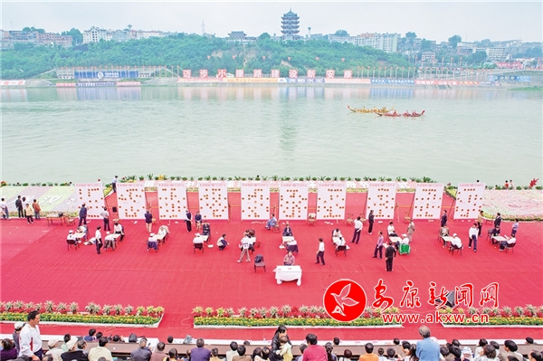 2009年第九屆安康龍舟節(jié)上,國家象棋特級大師柳大華與安康10位象棋高手進(jìn)行盲棋車輪戰(zhàn)。 邵向東 攝