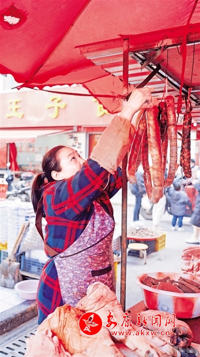 ⑩旬陽市下菜灣商貿(mào)小區(qū)內(nèi),商販正在忙著整理臘腸。