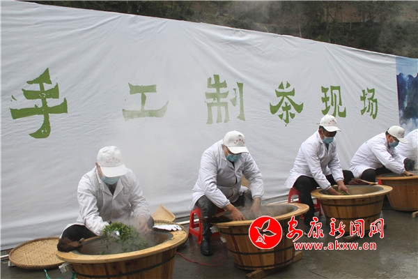 制茶人現(xiàn)場炒茶,介紹制茶的流程,突出嵐皋茶獨特制作工藝;茶藝師現(xiàn)場沖泡春茶,攤青、殺青、揉捻、做形、烘焙…新火試新茶,手工漸次綻現(xiàn),呈現(xiàn)千年古法傳承之景。