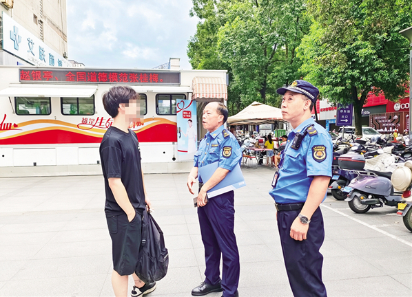 7月26日上午9時,安康市城市管理執法局漢濱分局執法人員沿金州路巡查至南方百貨門前廣場時,發現一名年輕男子很隨意地往地上吐了一口痰,隨即準備離開。