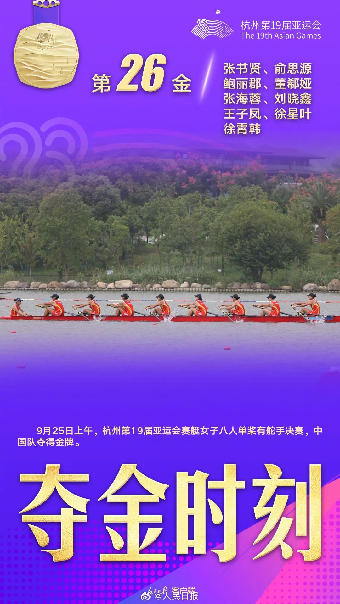 9月25日上午,在杭州第19屆亞運會賽艇女子八人單槳有舵手決賽中,中國組合張書賢、俞思源、鮑麗郡、董郗婭、張海蓉、劉曉鑫、王子鳳、徐星葉和徐霄韓奪得金牌!CJU安康新聞網(wǎng)