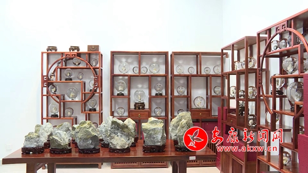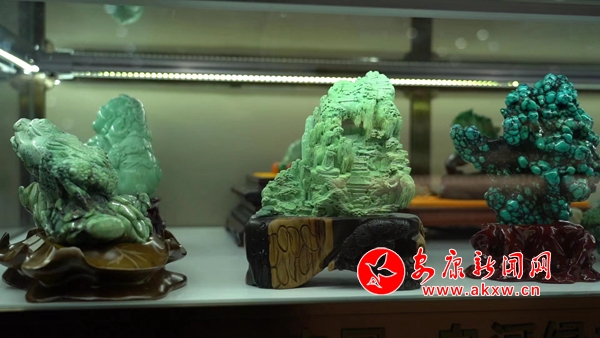 松石展柜中,擺放著各類精致時(shí)尚的綠松石飾品,這些通過雕刻家設(shè)計(jì)打磨后的擺件、項(xiàng)鏈、手鏈、耳墜等,都是藝術(shù)臻品,它們吸引著人們的目光,讓人愛不釋手。