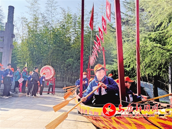 進(jìn)入翠屏島景區(qū),一艘龍舟顯得格外醒目,這是中國安康第十八屆漢江龍舟賽活動中獲得第一名的冠軍船,也是瀛湖代表隊的勝利之船。登上冠軍船體驗劃龍舟,是瀛湖研學(xué)中的重要一課。“賽龍舟作為安康傳統(tǒng)文化活動,是極具特色和代表性的,讓學(xué)生體驗劃龍舟,不僅很好地傳播了地方文化,也能將龍舟精神傳遞給學(xué)生,激勵他們團(tuán)結(jié)一致、勇往直前。”羅上順是陜文投安文旅公司的工作人員,同時也參與過好幾屆龍舟賽,在他的帶領(lǐng)下,學(xué)生們一邊喊著口號,一邊用力劃槳。“劃龍舟竟然是跪在船上的,一會工夫我的膝蓋就好疼了,那些在賽場上的選手真厲害!”同學(xué)們紛紛發(fā)出感嘆。