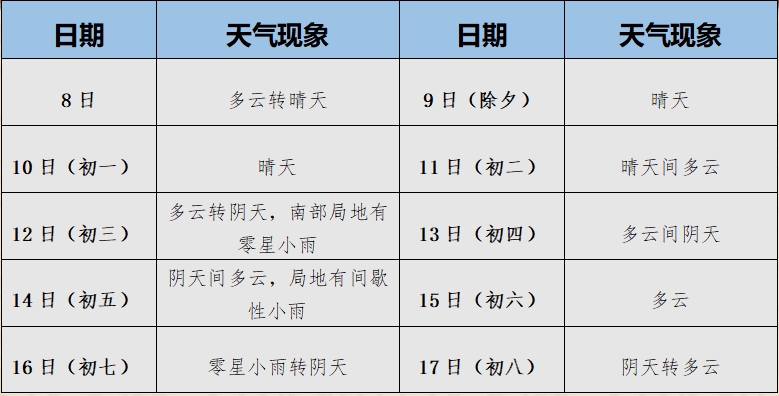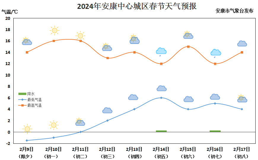 春節期間冷空氣對我市影響較小,最高氣溫起伏不大,預計川道地區 11~18℃,秦巴山區:8~14℃,最低氣溫初三以前相對較低,后期有所升高:川道地區 -2~5℃,秦巴山區:-5~1℃。MZM安康新聞網