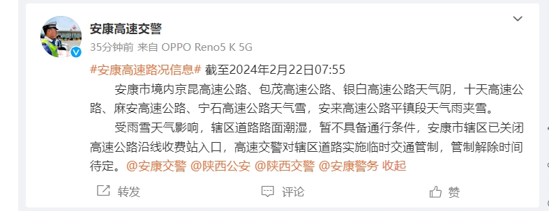 2月22日8時許,安康高速交警發布最新消息:截至2024年2月22日7:55安康市境內京昆高速公路、包茂高速公路、銀白高速公路天氣陰,十天高速公路、麻安高速公路、寧石高速公路天氣雪,安來高速公路平鎮段天氣雨夾雪。HFP安康新聞網