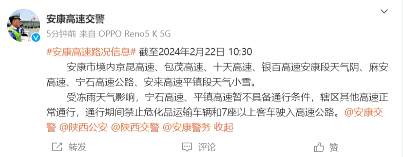 據(jù)安康高速交警消息:截至2024年2月22日10:30,安康市境內京昆高速、包茂高速、十天高速、銀百高速安康段天氣陰、麻安高速、寧石高速公路、安來高速平鎮(zhèn)段天氣小雪。受凍雨天氣影響,寧石高速、平鎮(zhèn)高速暫不具備通行條件,轄區(qū)其他高速正常通行,通行期間禁止危化品運輸車輛和7座以上客車駛入高速公路。ELM安康新聞網(wǎng)