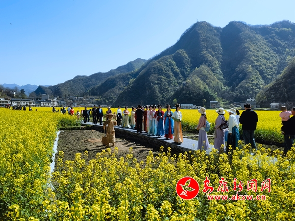活動現場,旬陽市仁河口鎮水泉坪景區萬畝油菜花海在陽光照耀下嬌俏迷人,和煦春風拂面而來,花海泛起層層疊疊的金色浪潮,濃郁的花香令人沉醉,絡繹不絕的觀眾和游客不時駐足拍照。精彩的文藝演出更是輪番上演,歌曲《油菜花開了》《旬陽人》、表演唱《庭院經濟富農家》、舞蹈《盛世花開》《家鄉的油菜花》《春頌》、嗩吶獨奏《百鳥朝鳳》、音樂快板《紅色傳承譜華章》、大筒子小戲《勸賭》等節目,讓觀眾目不暇接、贊不絕口,為景區增添了文化內涵、營造了藝術氛圍、給繁花似錦的油菜花海注入了生機活力。