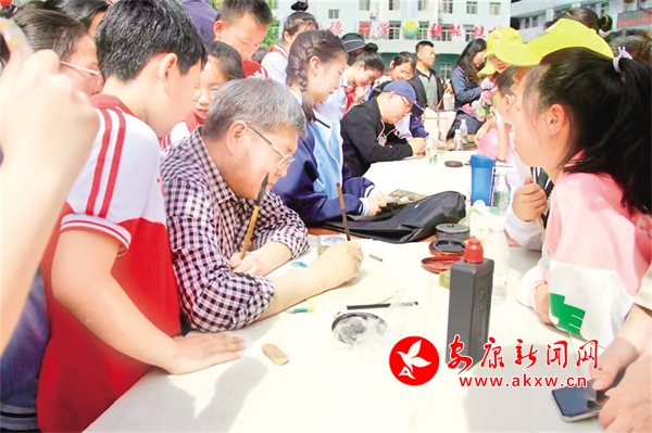 4月20日,白河縣城關小學舉辦讀書節活動,縣文聯書法家為孩子們書寫書簽。陳華 攝3sD安康新聞網