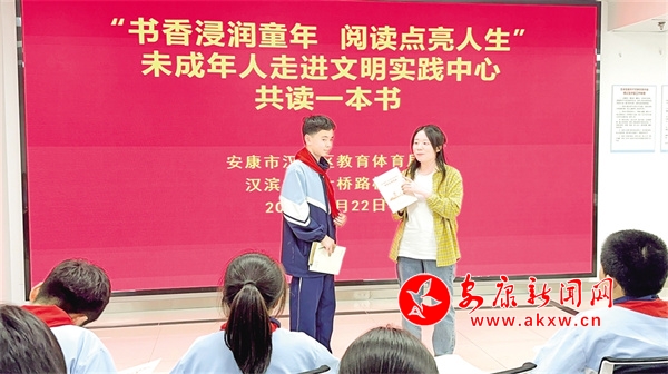 4月22日,漢濱初中大橋路校區學生走進漢濱區新時代文明實踐中心,開展“書香浸潤童年,閱讀點亮人生”共讀一本書活動。吳亞君 攝3sD安康新聞網
