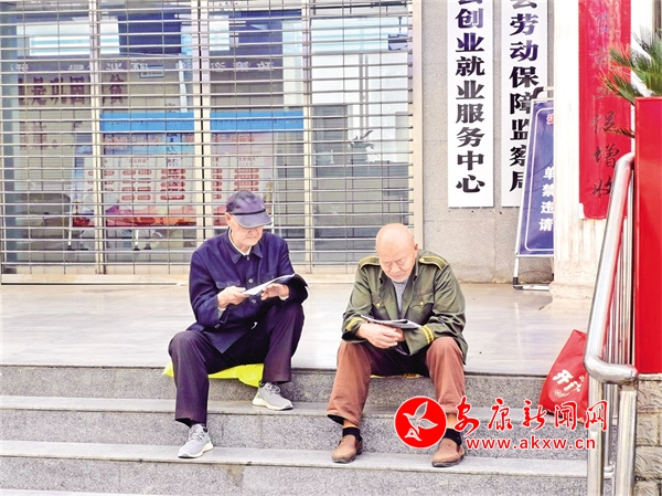 4月20日,在白河縣人社局門前,兩位老大爺各自捧著雜志閱讀。張陽敏 攝3sD安康新聞網