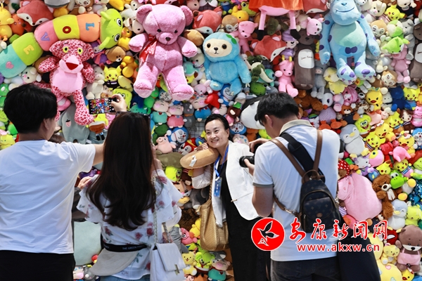 采訪團在恒口示范區毛玩中心拍照打卡。記者 潘潤生 攝