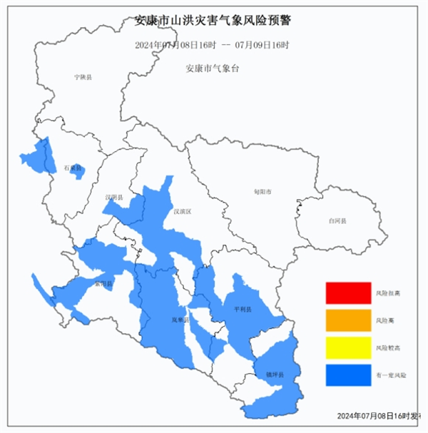本網訊 7月8日16時,安康市水利局、市氣象局聯合發布山洪災害氣象風險預警:預計,7月8日16時至7月9日16時,漢濱區中部、漢陰縣東部、石泉縣中部、紫陽縣、嵐皋縣、平利縣中部、鎮坪縣中南部有可能發生山洪災害(藍色預警)。 USc安康新聞網