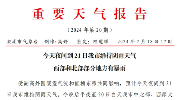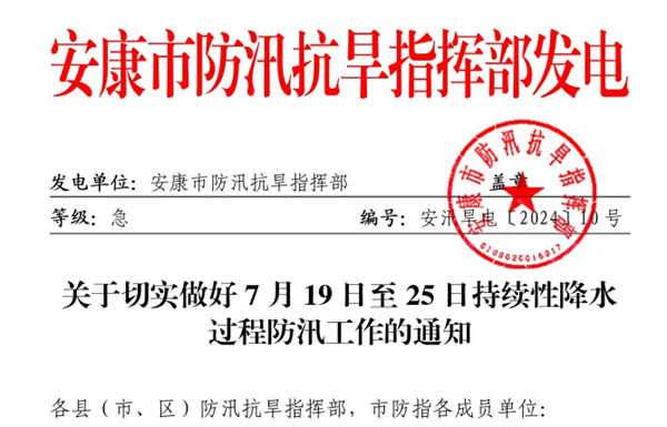 2024年7月19日10時18分接到省應急廳第192號《暴雨橙色預警》:預計未來3小時我市漢濱區、寧陜縣降雨量將達50 毫米以上,未來6小時我市漢陰縣、石泉縣、旬陽市、白河縣將達50毫米以上,以上地區境內發生山洪、泥石流等災害風險較高。