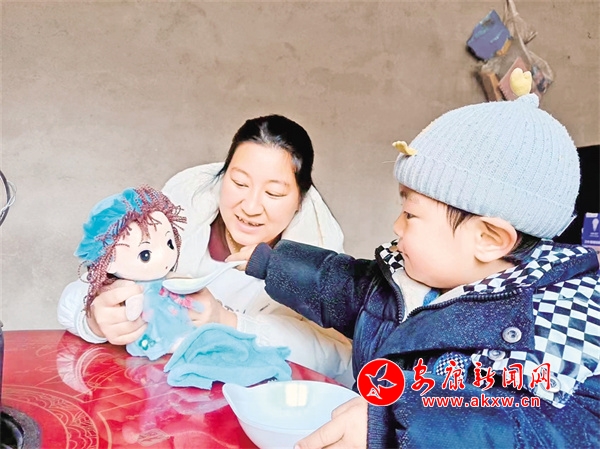 在城關(guān)鎮(zhèn)城北養(yǎng)育中心的教室內(nèi),養(yǎng)育師正在給孩子和家長(zhǎng)進(jìn)行一對(duì)一的課程輔導(dǎo)。“這是訓(xùn)練寶寶生活習(xí)慣的,根據(jù)寶寶吃飯的步驟,通過游戲的方式來(lái)慢慢地讓他養(yǎng)成良好的生活習(xí)慣……”