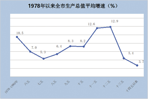 追趕超越步履堅實。從增速看,“六五”到“十五”年均增速為個位數(shù);“十一五”“十二五”時期發(fā)展較快,年均增速兩位數(shù),“十三五”年均增長5.4%,“十四五”前三年平均增長3.7%。從具體年份看,2007—2016年連續(xù)10年保持兩位數(shù)增長,其中2012年增長15.2%。自2009年起,全市GDP增速持續(xù)高于全省平均水平,尤其是2015年躍居全省第一,2015—2019年連續(xù)5年保持全省首位,呈后來居上、追趕超越之勢。2020年受疫情沖擊,增速回落至全省第9位,2023年全市經(jīng)濟平穩(wěn)恢復(fù),增長1.7%,發(fā)展進入新常態(tài)。