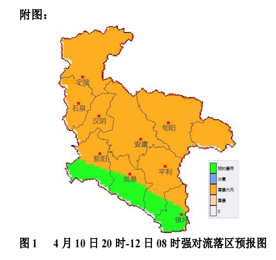 本網訊 4月10日10時,市氣象臺發布重要天氣報告:受低層切變和西南暖濕氣流影響,4月10日夜間至11日我市有一次強對流天氣過程,期間伴有雷電、短時強降水(10~15毫米/小時,局地可達20毫米每小時以上)、冰雹、陣性大風等對流性天氣。過程累計降水量:10~20毫米,個別鎮辦可達40毫米以上。11日至12日秦巴山區陣風可達7級以上,全市日最高氣溫下降顯著。