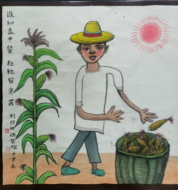 四年級的汪紫煊在參加夏令營時(shí),在玉米田里看到一幕,深深地吸引了她,一位農(nóng)民伯伯戴著草帽在烈日下,把玉米裝進(jìn)筐里。曾經(jīng)學(xué)過的詩句在她腦海里浮現(xiàn),文字變成了立體的畫面,她為自己這幅畫起名《誰知盤中餐 粒粒皆辛苦》。汪紫煊覺得,這種吃苦耐勞的精神要發(fā)揚(yáng),更要珍惜糧食,感受糧食的來之不易。