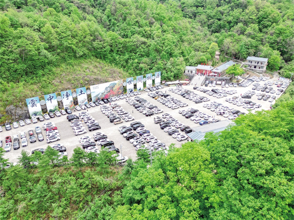 “五一”假期,嵐皋縣南宮山景區持續火爆。圖為“滿員”的北線停車場。 陳陽 攝