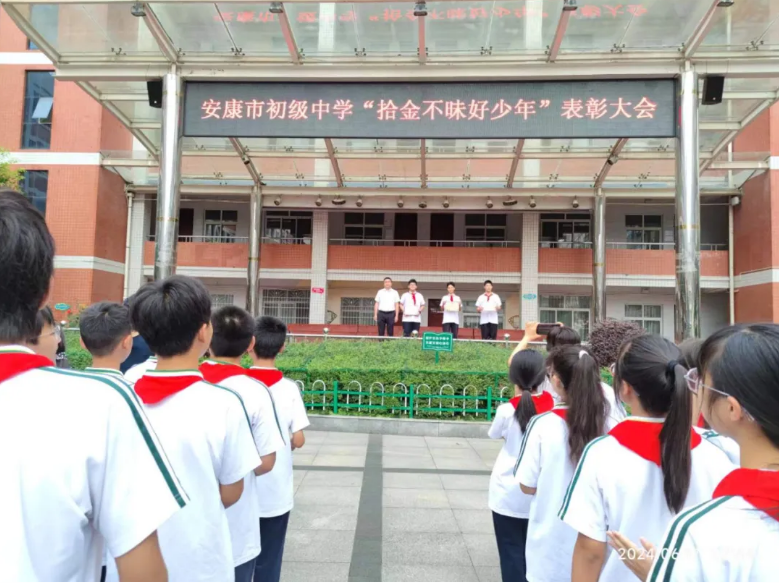 6月17日上午,安康市初級中學舉行了一場表彰大會。表彰我校初一四班景永強、汪正男、馬崇偉三位同學拾金不昧的行為,并為其頒發獎狀,引導全校師生學習這種拾金不昧的優良品質,將傳統美德內化于心,外化于行。