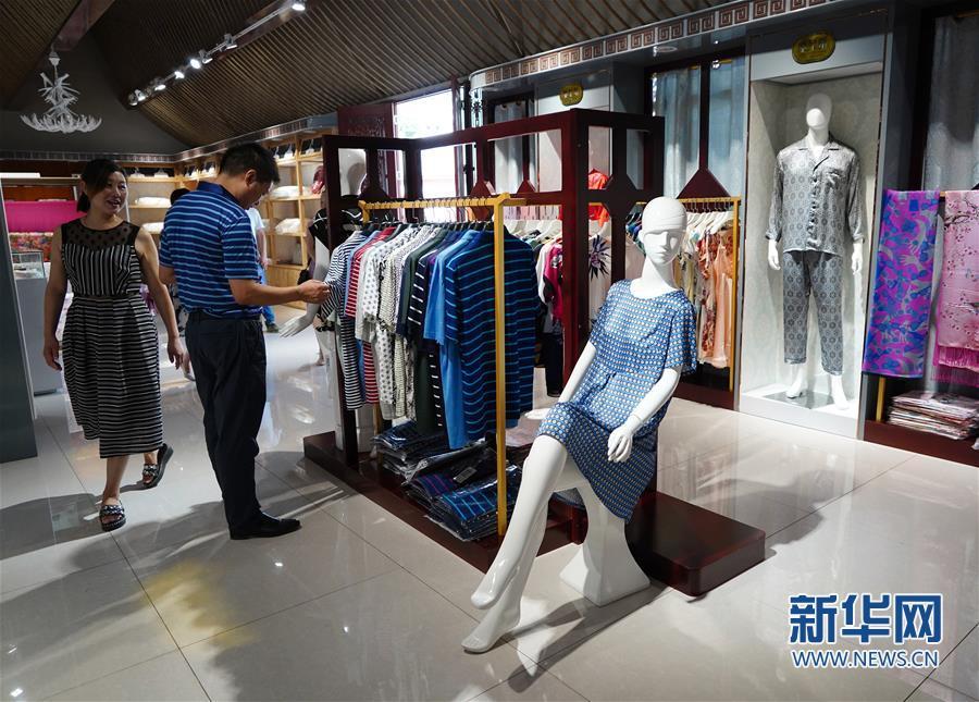 7月19日,游客在石泉蠶桑文化園內挑選絲綢服裝。新華社記者 邵瑞 攝