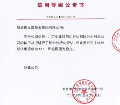 近日,經過北京中北聯信用評估有限公司綜合評定,安康市發展投資集團有限公司成功獲評AA+主體信用等級,評級展望為“穩定”,成為我市乃至陜南地區首家獲得AA+主體信用評級的市屬國有企業。此次評級成功通過,是市委市政府全面推動“以市帶縣”整合效應的釋放,也是資本市場、信用機構對我市經濟社會發展水平和集團公司發展后勁的充分認同和肯定,將為進一步拓寬融資渠道、提高融資能力和降低融資成本創造有利條件。