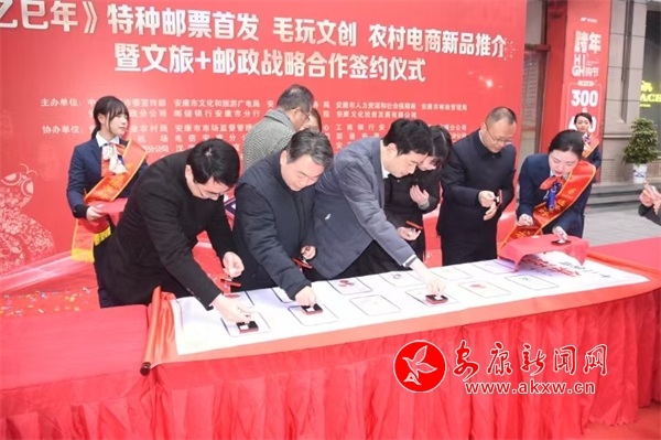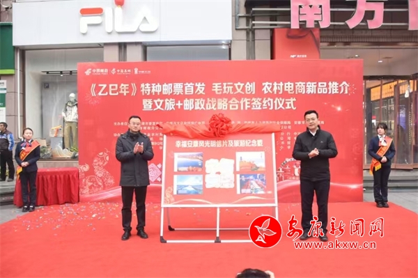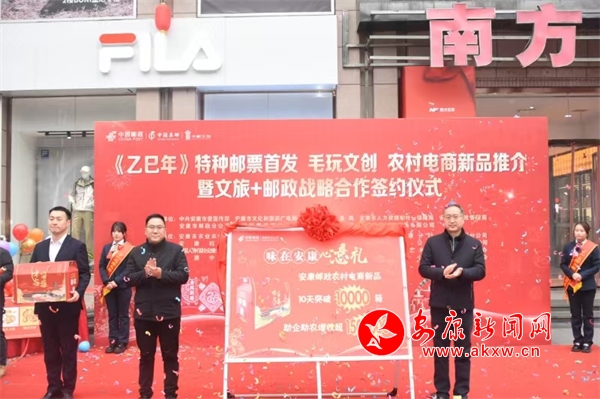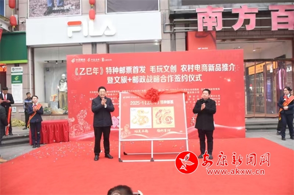 本網(wǎng)訊(通訊員 沈巧苗)龍騰辭舊歲,巳蛇報春來,1月5日上午9點,《乙巳年》特種郵票首發(fā)、生肖毛玩文創(chuàng)、農(nóng)村電商新品推介暨文旅+郵政戰(zhàn)略合作簽約活動舉辦,現(xiàn)場參加活動人達300余人。