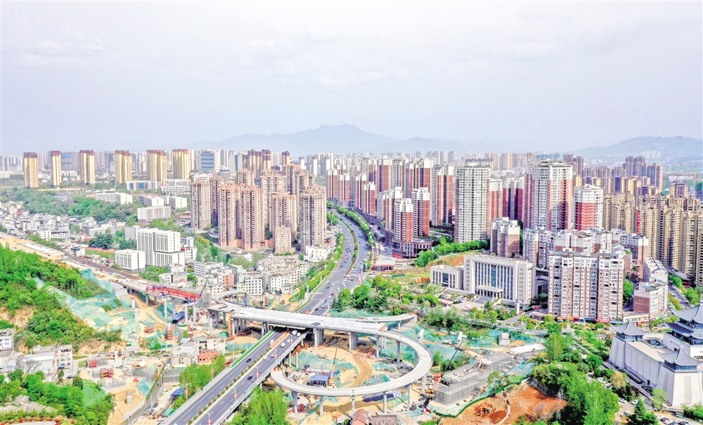 4月9日,航拍鏡頭下的七里溝立交橋項(xiàng)目。 周亭松 攝sN8安康新聞網(wǎng)