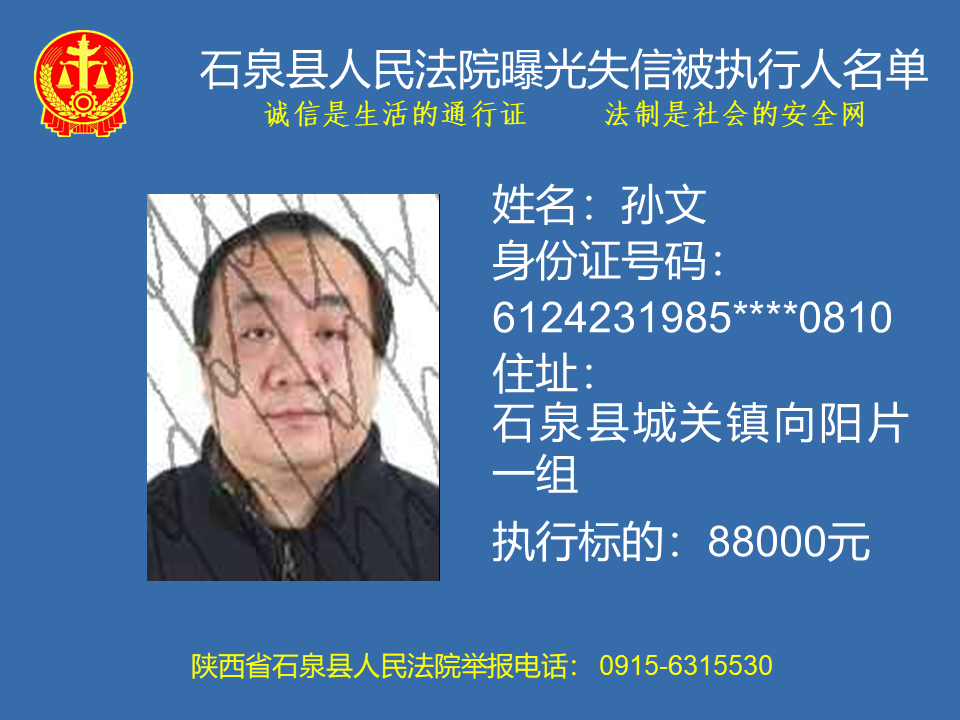 為了進一步加大執行力度,保障勝訴當事人的合法權益,推進社會誠信體系建設,依照《中華人民共和國民事訴訟法》、《最高人民法院關于公布失信被執行人名單信息的若干規定》等法律、司法解釋的有關規定,現對一批已進入執行程序,且尚未全部履行義務的被執行人進行媒體曝光,歡迎廣大群眾支持石泉縣人民法院的工作,向我院提供被執行人的財產線索,使生效法律文書能夠得到切實執行,讓人民群眾切實感受到公平正義就在身邊。