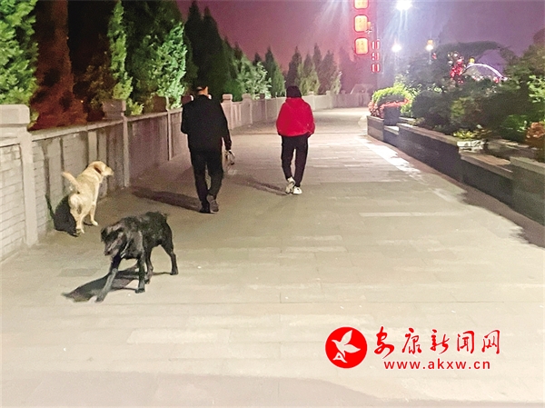 4月5日晚,安康城區城堤上有市民遛狗不牽繩。胡波 攝