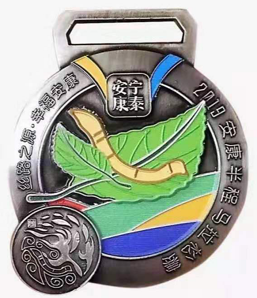 據(jù)獎牌設(shè)計者金沙介紹,本次完賽獎牌于十月初開始設(shè)計,10月29日正式公布。獎牌正面核心畫面選擇了出土于安康的一級文物—鎏金銅蠶,銅蠶附于桑葉之上,既突出了悠久的桑蠶文化,又是本次主題“絲路之源”的體現(xiàn)。