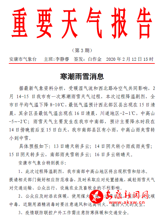 市氣象臺特別提示,此次過程降溫劇烈,我市南部中高山地區將出現積雪和結冰提請相關部門做好相應防范準備;公眾應及時添衣保暖,使用煤火取暖時注意通風,謹防一氧化碳中毒,近期用酒精消毒時要注意通風和遠離明火,謹防火災的發生;疫情聯防聯控戶外工作需注意防寒保暖和交通安全。