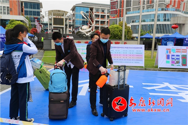 工作人員與老師在校門口有條不紊地開展著校園防疫工作,測體溫、查看“健康碼”、對行李及物品進行消毒等工作有序進行著。學校高三年級29個班、1300多名學生實行錯峰報到,在今天早上9點至下午15點,分批次從學校正門的四個通道進入校園。QbV安康新聞網