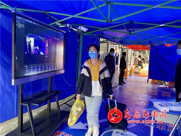 在漢濱初中高新校區校門口,記者看到學生們戴著口罩保持著安全距離在排隊進入校內,旁邊還有很多幫孩子拿行李的家長在向他們交代相關注意事項。排在前列的學生有序將自己的健康信息表交給負責檢查的工作人員核對,通過之后會進入一個設有熱成像紅外線人體測溫儀的檢測點,每個從里面經過的學生體溫都會出現在測溫儀的大顯示屏上,工作人員緊盯著屏幕排查異常人員。v9a安康新聞網