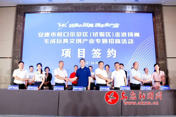 推介會上,恒口示范區和市直相關部門分別就營商環境、毛絨玩具產業政策、金融支持政策及重點項目作了推介。恒安玩具有限公司,安康市毛絨玩具文創產業協會負責人和揚州市工商聯、市毛絨玩具行業協會、企業代表分別發言。現場簽約項目16個,總金額額18.5億元,涵蓋毛絨玩具文創產業創意設計、生產加工、倉儲物流和運營策劃等全產業鏈條和醫療康養、現代教育等諸多領域。