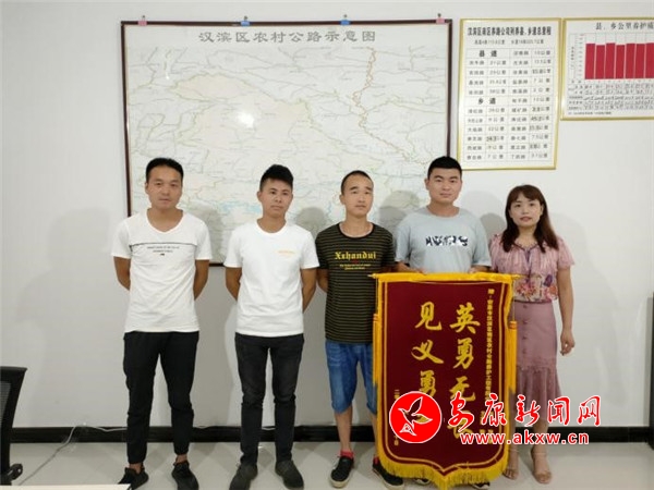 8月20日上午,周女士帶著家人一起來到漢濱區農村公路管理局南區養護公司感謝四名公路英雄,并將寫有“見義勇為 英勇無畏”的錦旗送給了陳超、陳光飛、艾全軍、鄭小豪四人,感謝他們英勇無畏救其性命,救她順利脫險!
