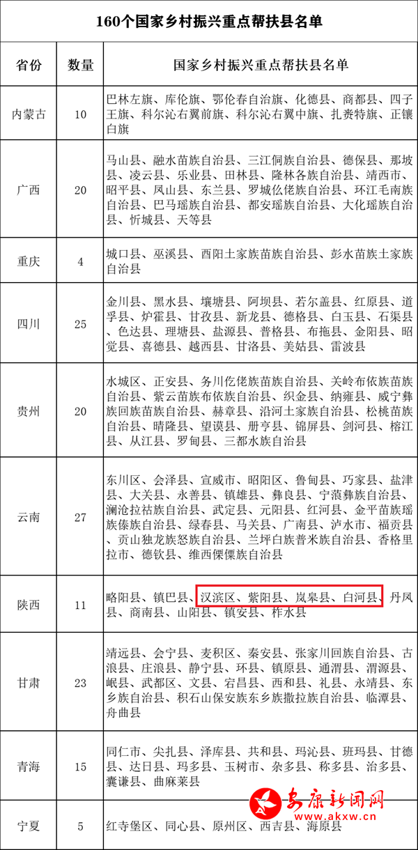 陜西省有11個(gè)縣被列入國(guó)家鄉(xiāng)村振興重點(diǎn)幫扶縣,其中,安康有4縣(區(qū)),分別為漢濱區(qū)、紫陽(yáng)縣、嵐皋縣、白河縣。