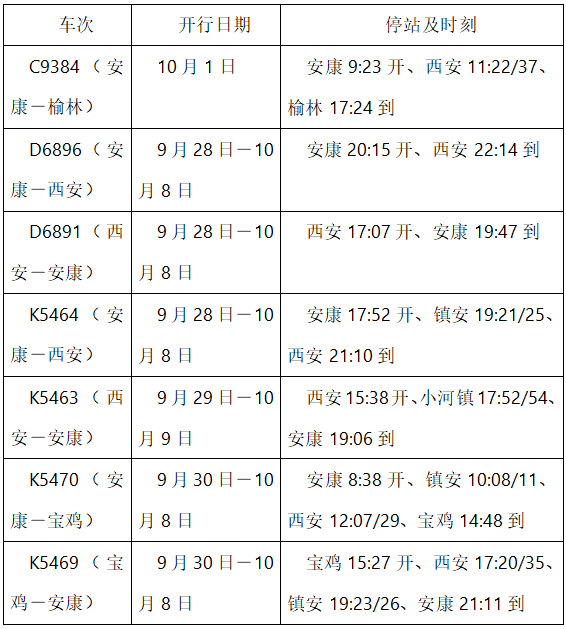 據悉,10月1日,首次加開安康至榆林城際列車1列;9月28日至10月8日,安康—西安間,每日加開“復興號”動集動車組1對,普速列車1對;9月30日至10月8日,安康—西安間,每日加開普速列車1對。