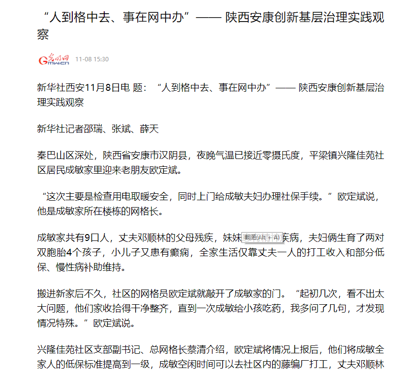 本網訊(實習記者 趙漪湉)11月8日,新華社刊發記者邵瑞、張斌、薛天采寫的稿件《“人到格中去、事在網中辦”——陜西安康創新基層治理實踐觀察》,聚焦我市創新建立的“321”基層治理模式。zun安康新聞網